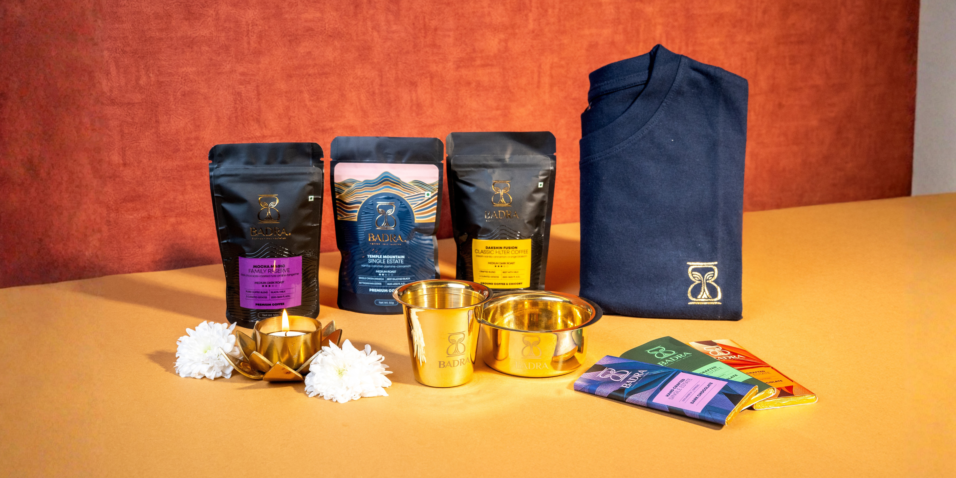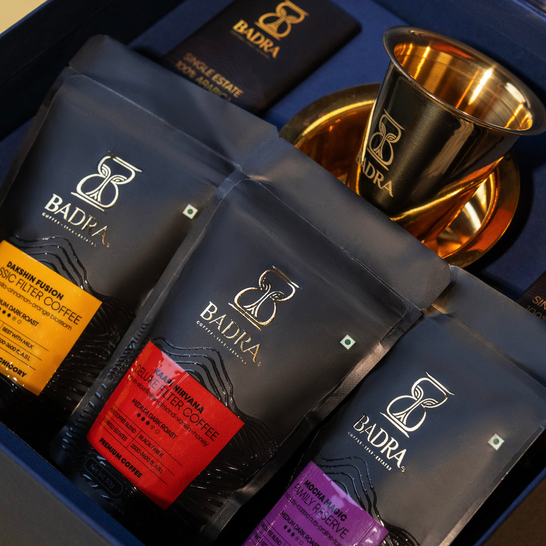 Celebrate Diwali with our limited-edition hamper, featuring 3 or 5 mini packs of our award-winning coffee blends, handcrafted to let you explore the range and richness of Badraβs estate-grown coffees. Each box also includes two coffee-infused chocolates and our signature brass filter coffee tumbler set β a blend of tradition, taste, and thoughtful gifting.