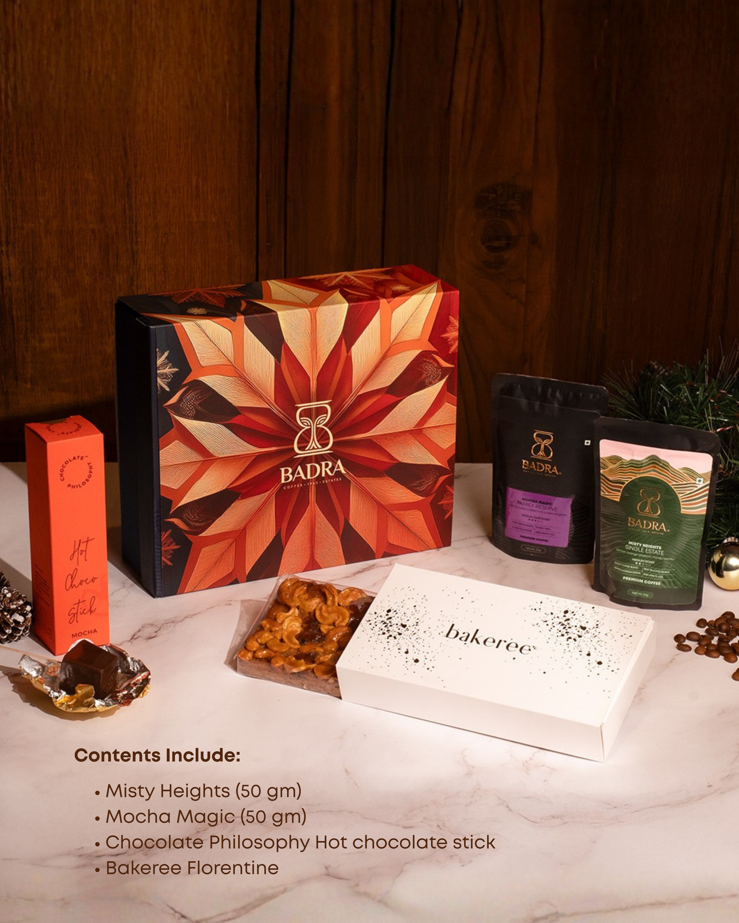 Celebrate the season with our specially curated Christmas Gift Box, crafted in collaboration with two exceptional Indian artisanal brands. This festive collection features two of our signature mini coffees, a buttery nut florentine from Bakeree that mirrors the notes of Misty Heights, and a handcrafted mocha hot chocolate stick from Chocolate Philosophy paired to complement Mocha Magic. Thoughtfully assembled to bring together flavour, craftsmanship, and holiday warmth, this box makes the perfect gift for loved ones—or a delightful way to elevate your own festive moments.